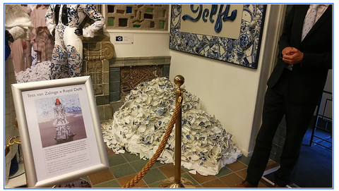 (Above) A local Fashion Design student, Tess Van Zalinge took the icon to a new level by applying it onto her garments. The guide mentioned that she spent several months at the Royal Delft to complete her research and for her fashion show, the factory contributed broken earthenware (below) to decor the runway.