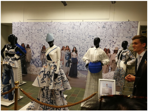 (Above) A local Fashion Design student, Tess Van Zalinge took the icon to a new level by applying it onto her garments. The guide mentioned that she spent several months at the Royal Delft to complete her research and for her fashion show, the factory contributed broken earthenware (below) to decor the runway.