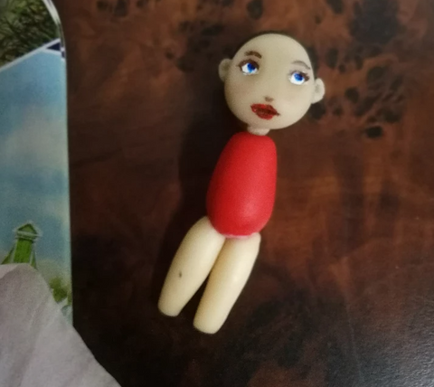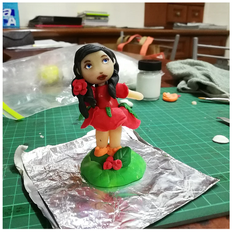 Next I attempted to model the face, arms and legs for Rosa. This time instead of mixing my clay with acrylic paint, I added a little bit of orange clay from Yenji’s Air-dry Clay. This was a bit of a risk as it was a combination of two different substances – a word of advice: do not try it! The clay became softer, more oily and extremely hard to model so I had to let it semi harden overnight before adding on the details.