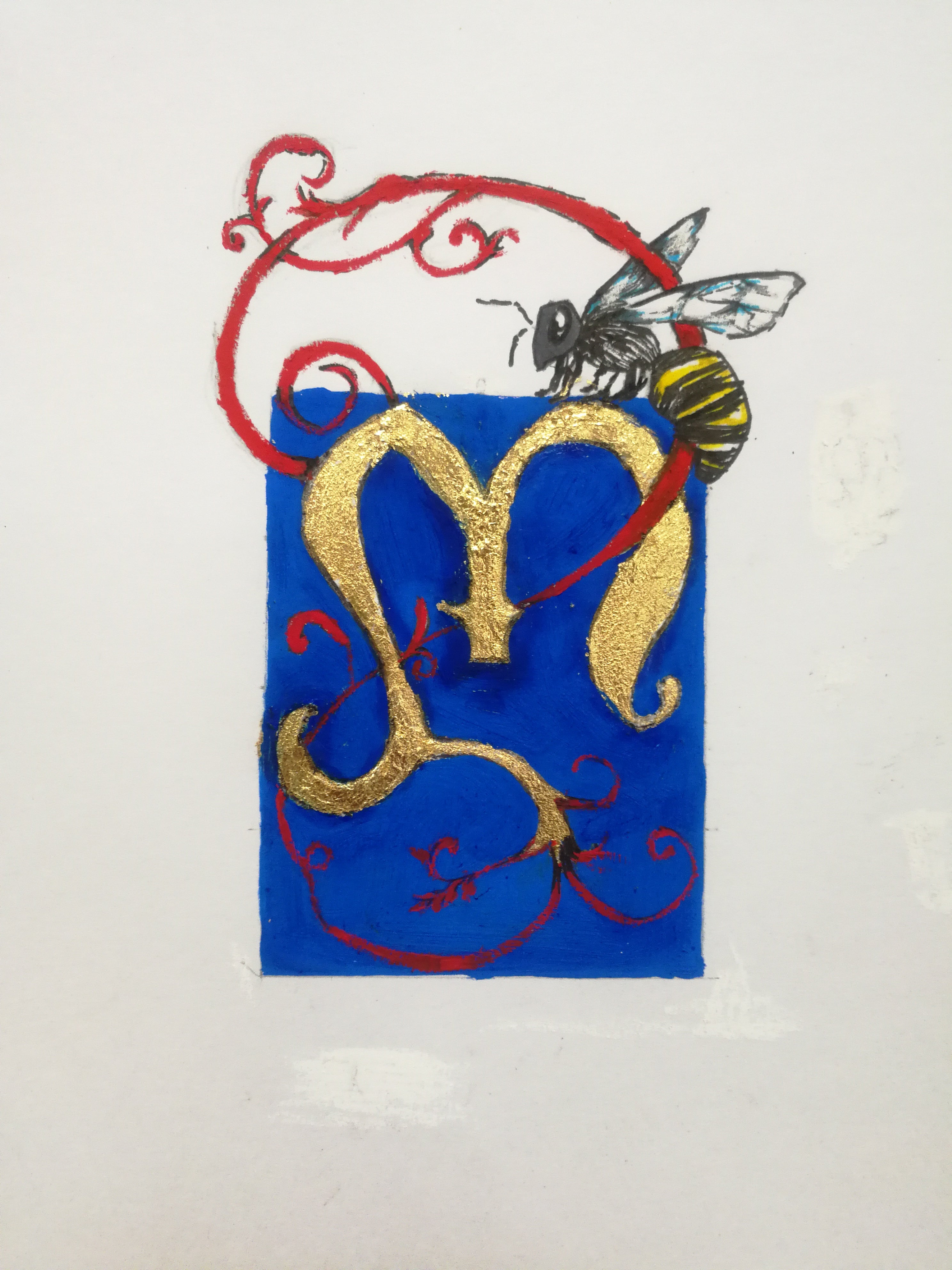 Similarly, I used the gilding technique. So to start of, I made some simple sketches and from there started to make a simple grid to draw my letter. Once I was happy with the vines and the little bee which is the Greek representation of my name, I mixed a little gesso with water and painted over the alphabet. This was to create a little emboss effect. Once that was dried, I took it over to my History of Art class and provided them with the gilding demo. This was accomplished by brushing a light layer of adhesive and slowly laying a sheet of gold leaf. Gently tap the leaf down so it may stick to the adhesive and later I used a brush to remove the excessive leaf to reveal an illuminated alphabet.