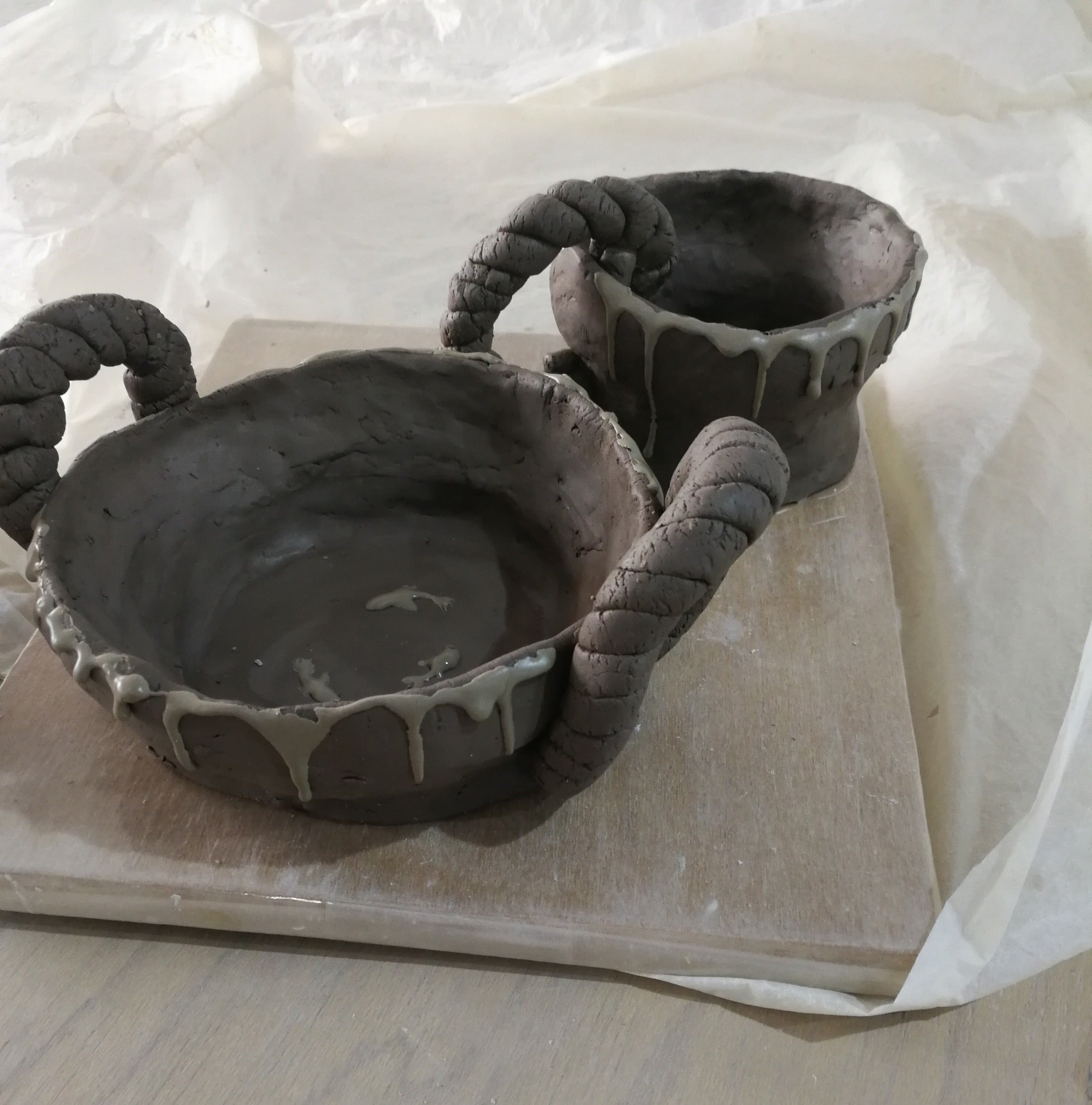 The hardest part was controlling the coiling as the try to manage the shape requires not only patience but a firm and unshaken hand. The cup did not turn out the way I hoped but it will do for now.The next thing I learnt was spiralling the handles. Now that was truly tricky, I had to work really fast so as to avoid it from drying too quickly and from splitting. So to touch it up finally, I decided to drip off some slip on the edges. That was inspired by one of the pieces I had seen on the drying shelf.