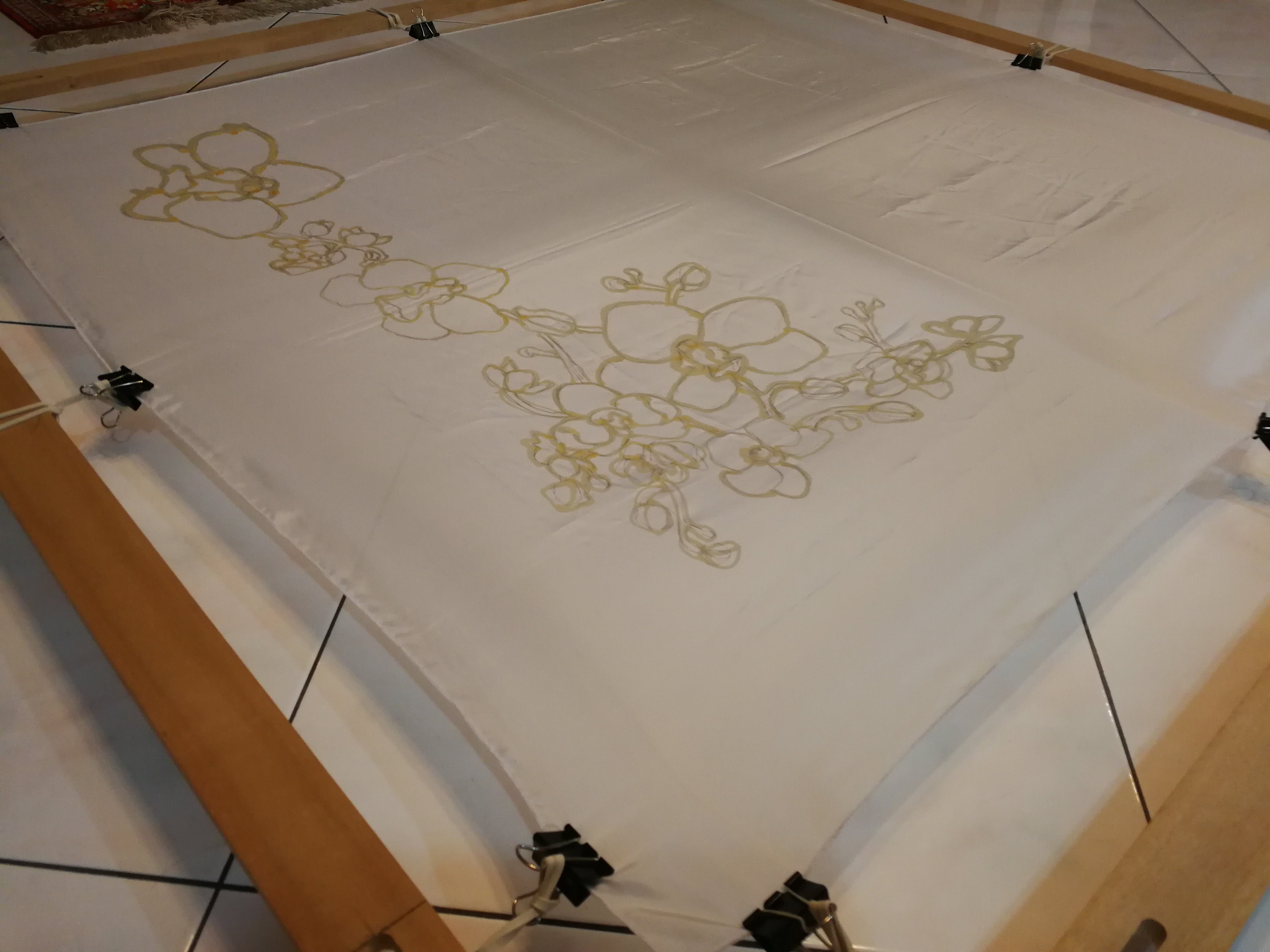 In total, it took me a solid one and half to complete the entire scarf. So once I sketched the design onto the scarf and propped it onto the frame, I started to wax resist the design.